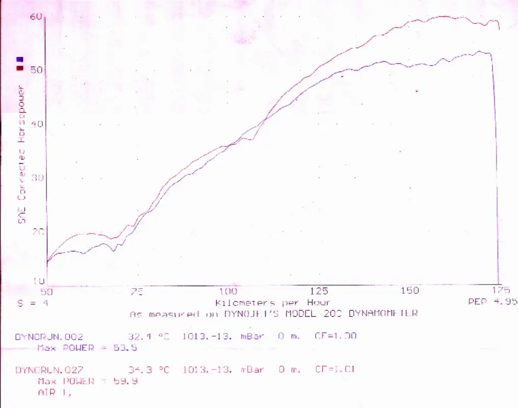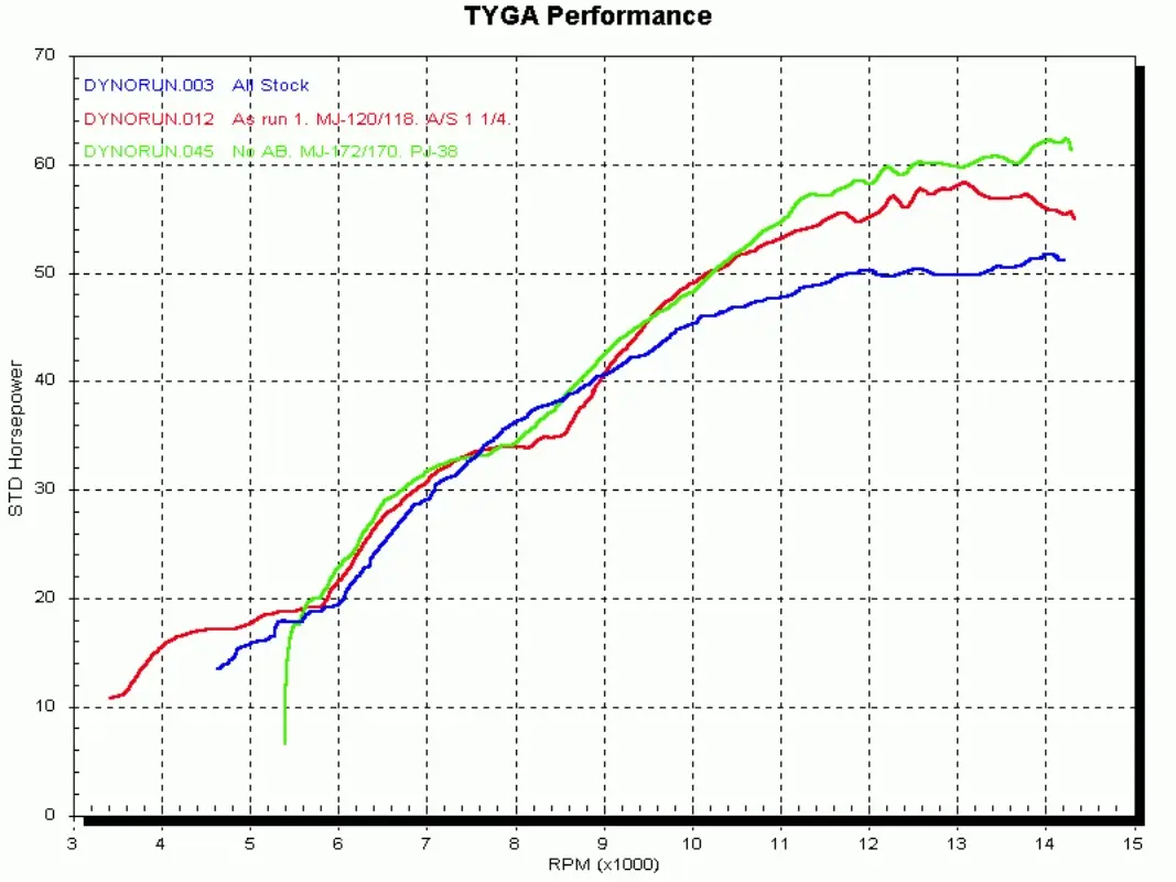 With just the TYGA pipe (red line) and a couple of main jet changes, the power leaps from a stock 52hp up to a healthy 59hp. That’s 7hp, or 13.5% more.