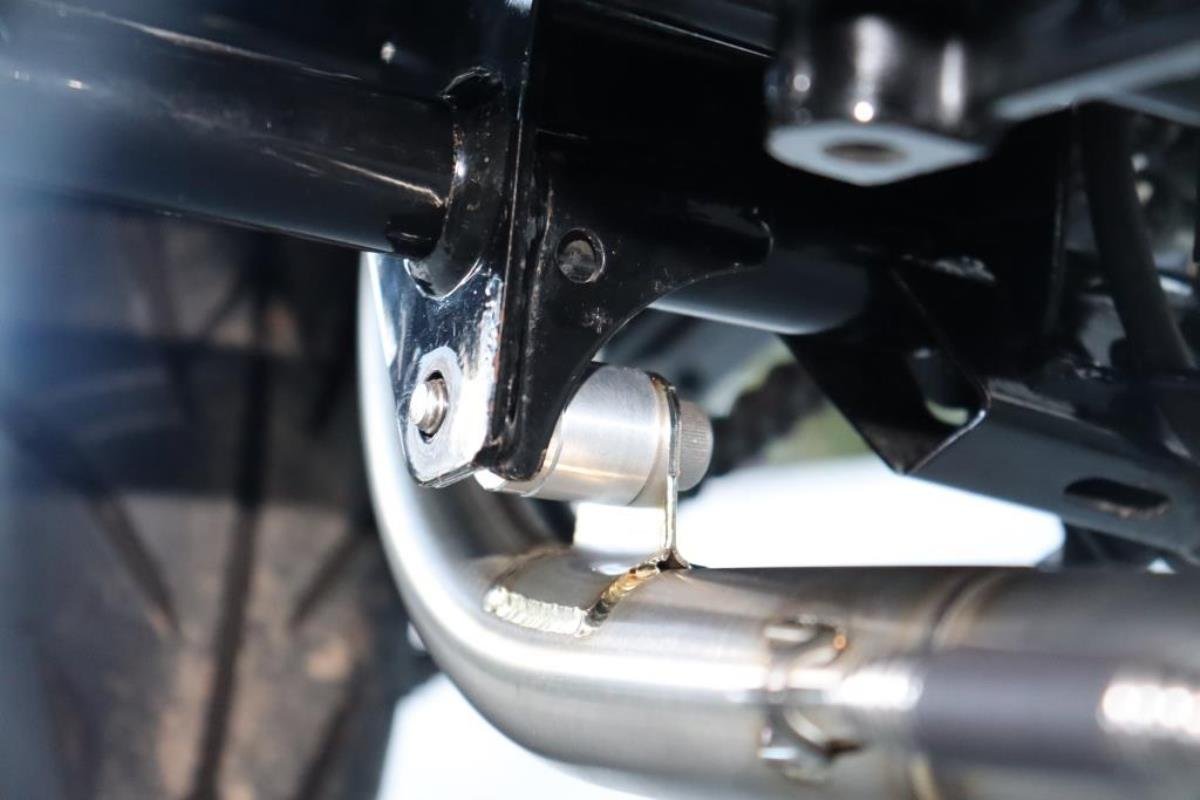 Note, this exhaust system is secured to the exhaust mounting lug on the frame on the inside as shown in the photo, unlike the stock exhaust which mounts to the outside.