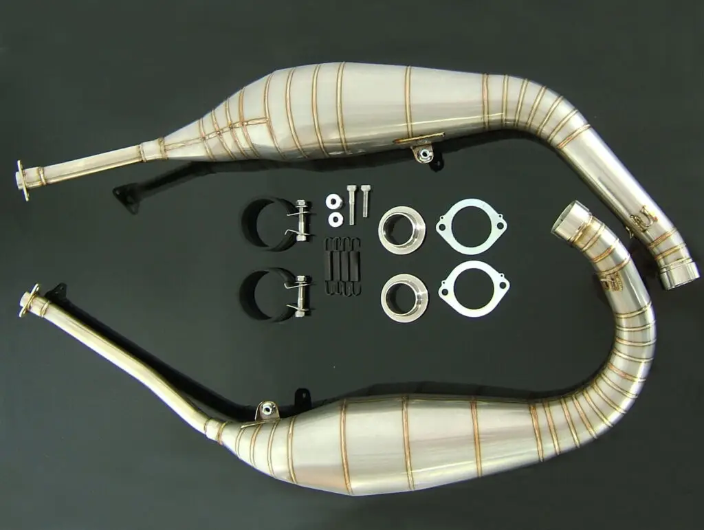 The stock chambers on most two stroke bikes are both heavy and low in power. This is because of strict laws in Japan or Europe which the manufacturers have to comply to. Many chambers are double skinned for example and have small headers to restrict the flow of gas. By just fitting silencers, you are missing out on optimising the full potential of your bike.
