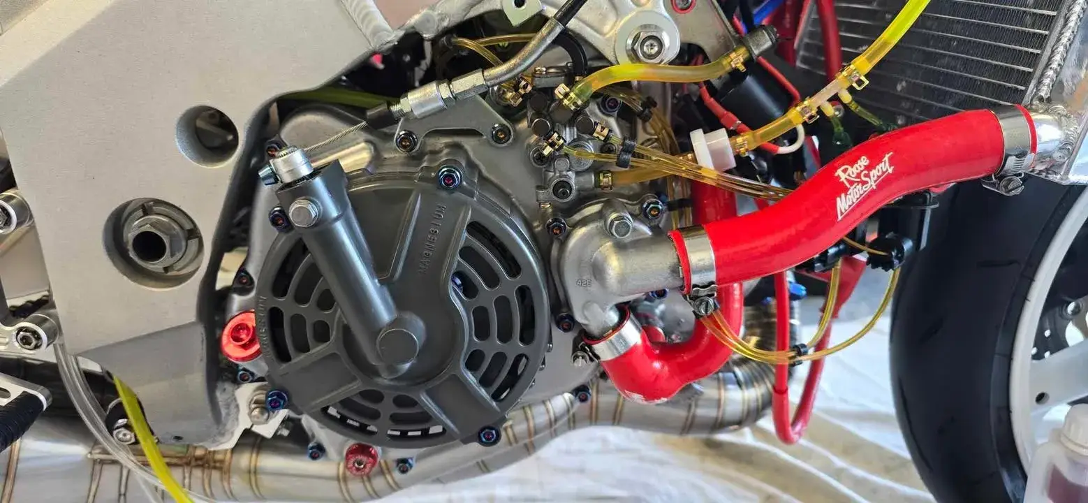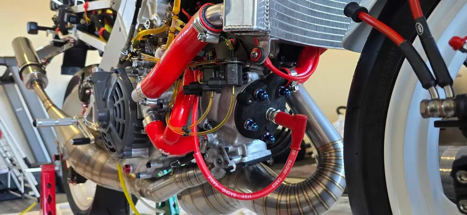 Engine cases flowed, Cylinders flowed and bridge port cleaned up, Ports and PV valves mirror polished. All fuel and oil lines upgraded to tygon. All work was done in house with the help of a very wise friend”.