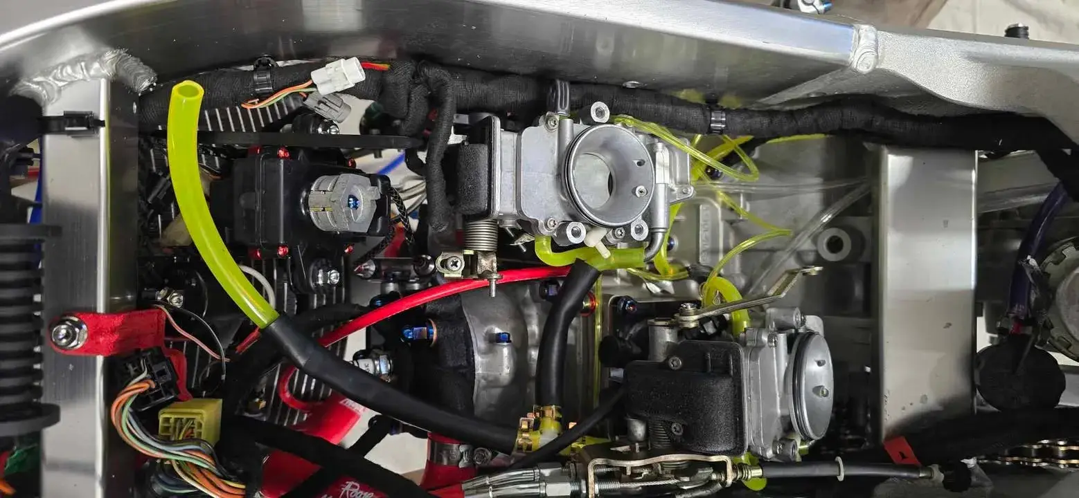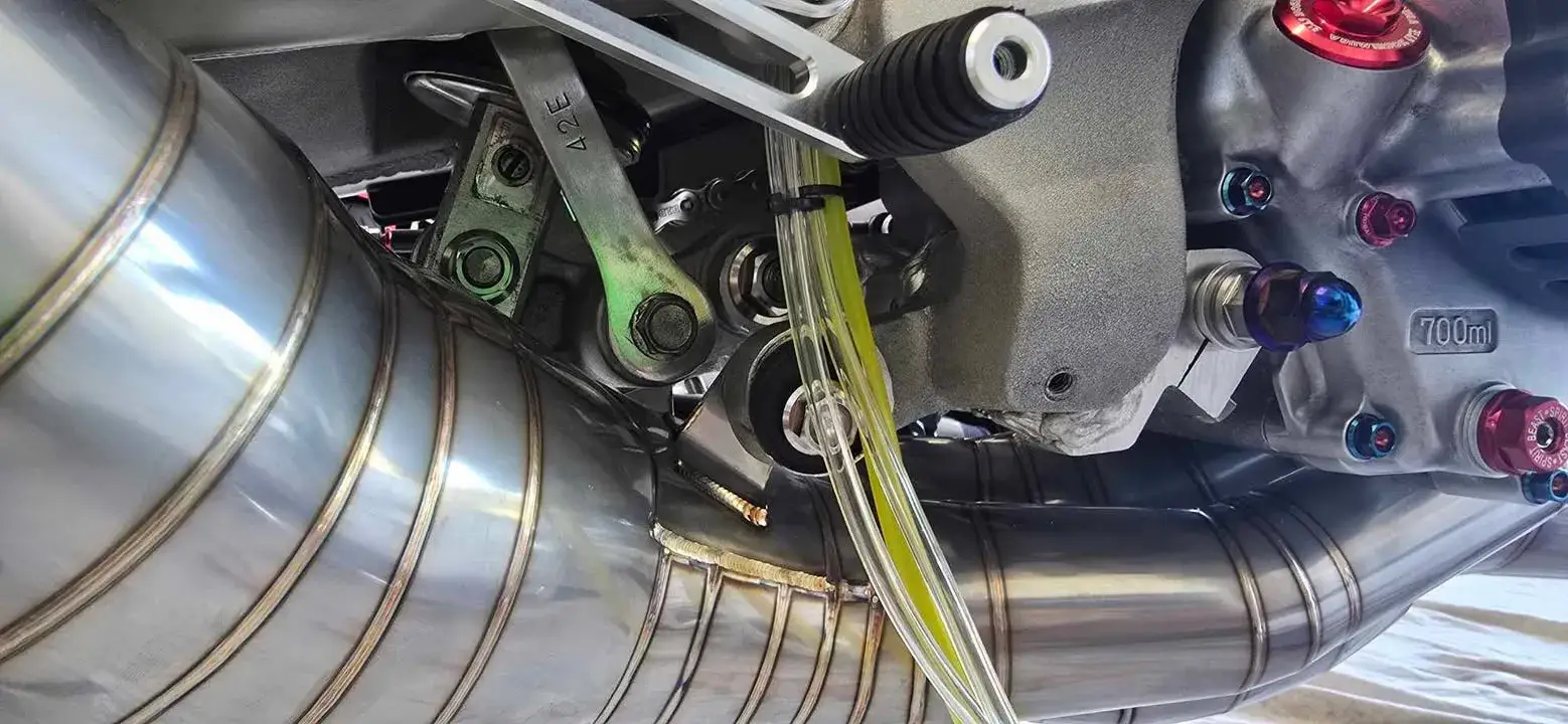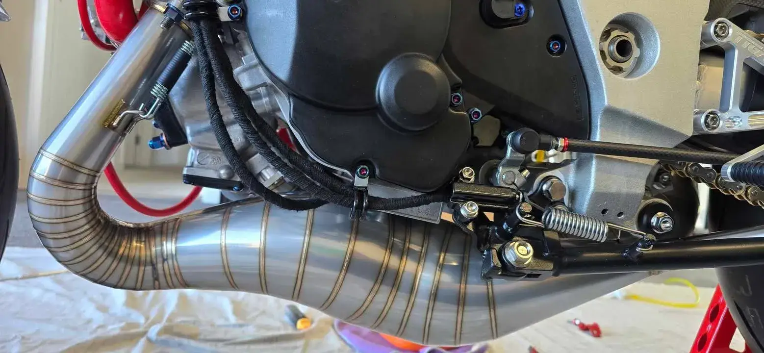 Every bolt and nut was swapped for titanium, every wire bracket was hand-made from titanium rods.